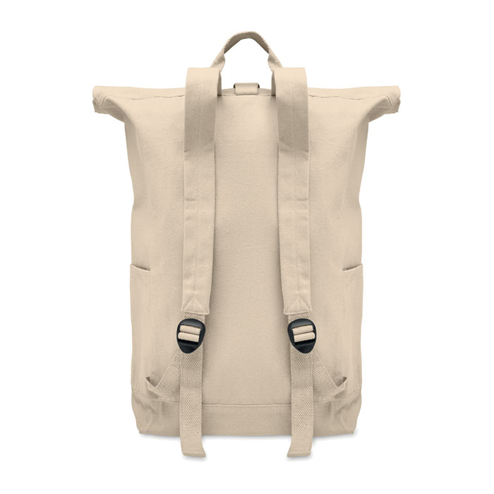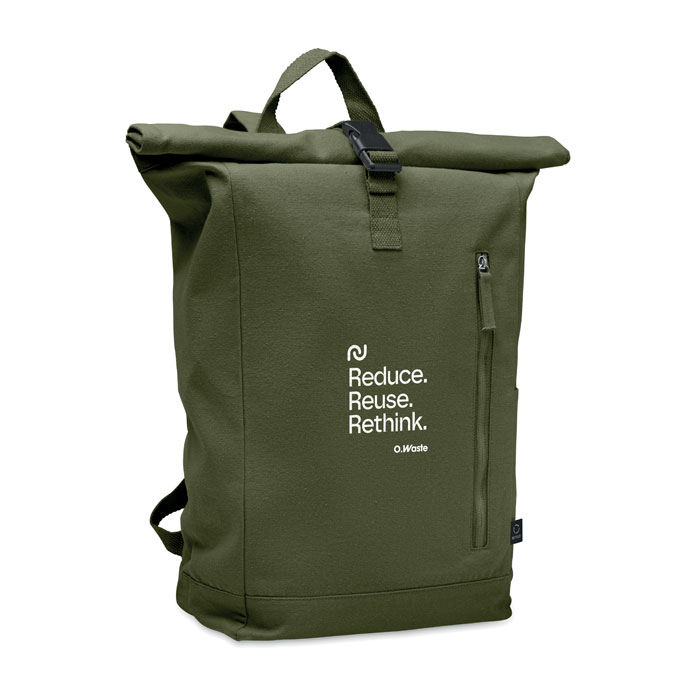 Rolovací batoh 390g. Reklamní batoh se zapínáním na suchý zip z 390g recyklované bavlny (80 %) a recyklovaného polyesteru (20 %). Přední kapsa na zip.