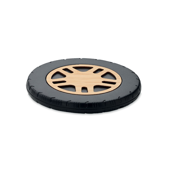 Bezdrátová nabíječka 15W. Reklamní bezdrátová nabíječka v designu kola je vyrobena z recyklovaného ABS plastu s bambusovým vrškem. Výstup: DC 9V/1,10A (15W) pro rychlé nabíjení. Kompatibilní s nejnovějšími zařízeními Android, iPhone® 12, X a novějšími.